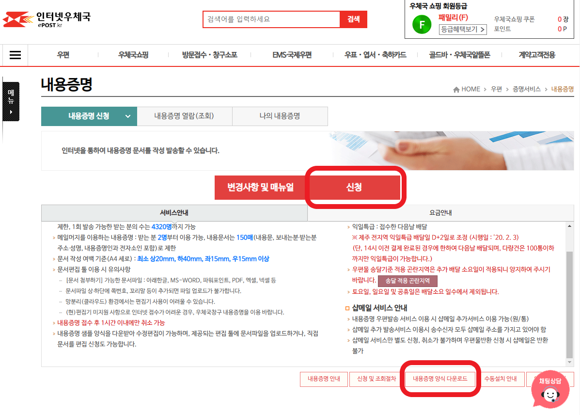 다음 화면에서 '신청'을 클릭합니다. 혹시 내용증명을 어떻게 쓰는지 모르실 경우 아랫쪽의 [내용증명 양식]을 다운로드 하시면 됩니다.
