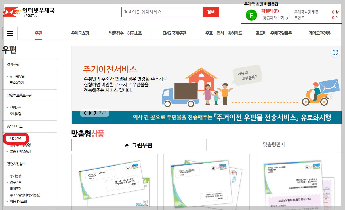 메뉴에서 [우편 - 증명서비스 - 내용증명] 을 클릭합니다.
