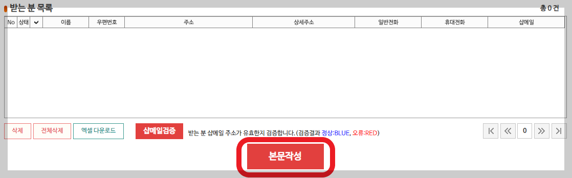 수신인과 발신인의 인적 사항까지 작성 후 본문 작성을 클릭합니다.