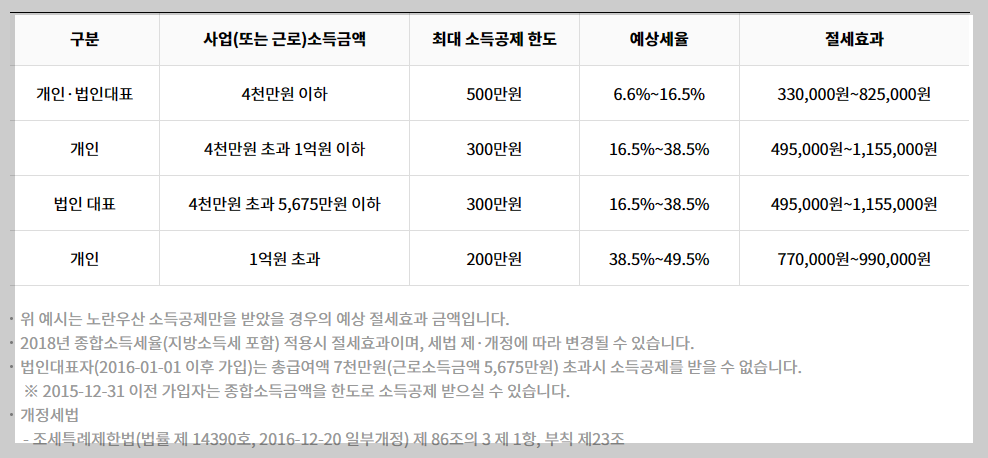 납입부금에 대해 연간 최대 500만원 소득공제 혜택을 부여하므로 세 부담이 높은 사업자의 절세전략으로 탁월합니다.