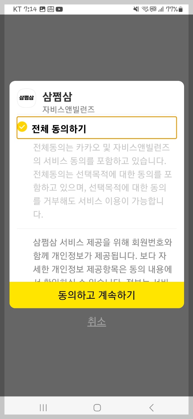 카카오 계정으로 계속하기를 누르고, 전체 동의 후 계속하기를 눌러주세요