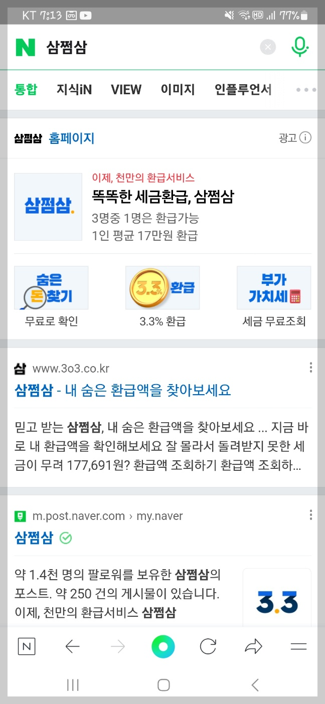 먼저 핸드폰에서 네이버 어플을 열고 검색창에 "삼쩜삼" 검색합니다.