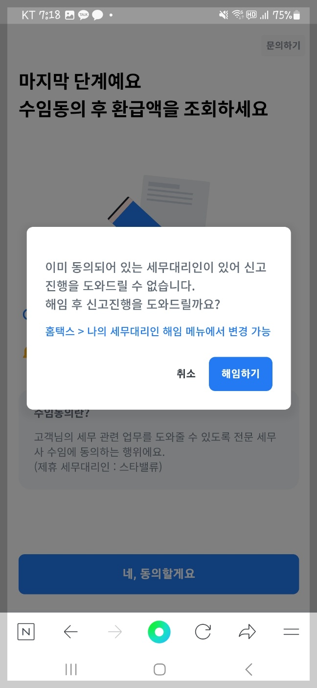 세무사 수임동의를 해야하는데 이미 동의되어 있는 세무대리인이 있다고 나와서 해임 후 다시 세무사 수임동의를 했습니다.