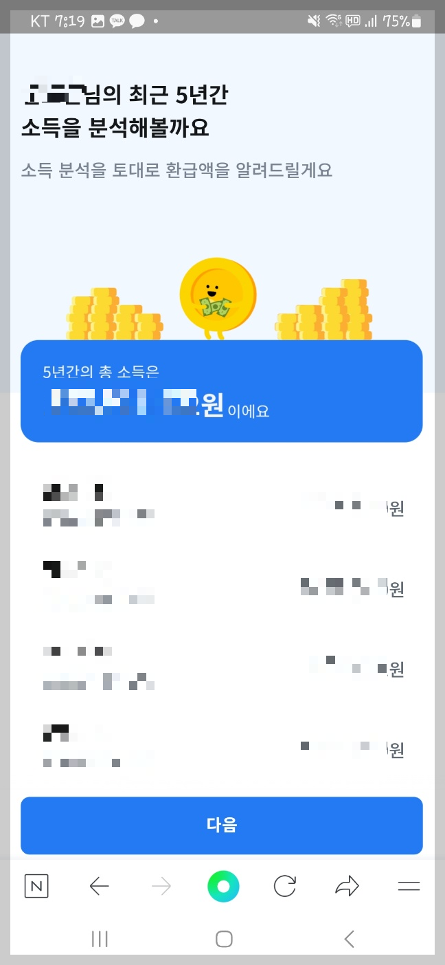10초정도 기다리면 5년간의 소득을 조회하고 소득을 분석해 줍니다.