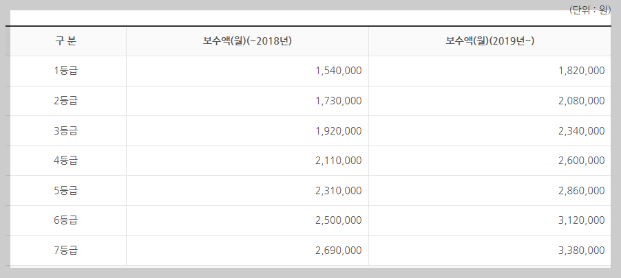 - 기준보수는 2016년 이후는 총 7등급, 2015년 이전은 총 5등급으로 구분됩니다.