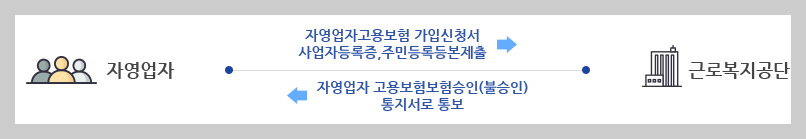 - 가입을 희망하는 자영업자는 [자영업자 고용보험가입 신청서]에 사업자 등록증, 주민등록등본 등을 첨부하여 근로복지공단(지사)에 제출하면 됩니다.
