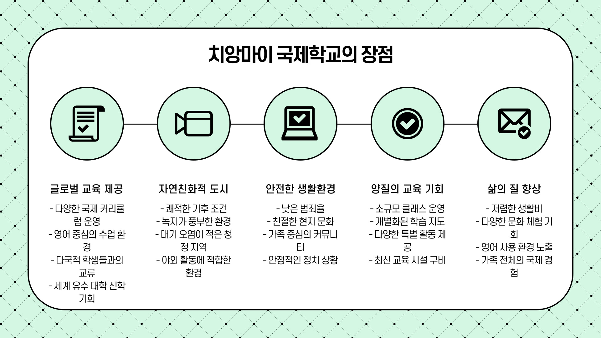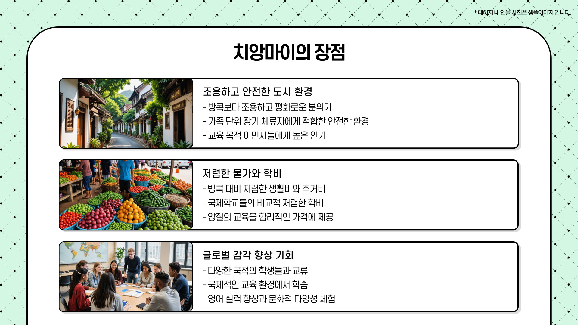 치앙마이는 방콕보다 조용하고 물가가 낮으며, 안전한 환경을 갖춘 도시입니다. 이런 이유로 가족 단위의 장기 체류자나 교육 목적 이민자에게 인기가 높습니다. 또한, 국제학교들이 비교적 저렴한 학비로 양질의 교육을 제공하며, 다양한 국적의 학생들과 함께 글로벌 감각을 키울 수 있습니다.