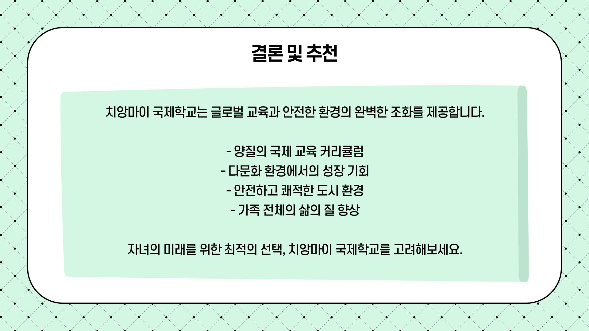 치앙마이 국제학교는 자녀에게 글로벌한 교육을 제공하고자 하는 가족에게 매우 매력적인 선택지입니다. 자연친화적이고 안전한 도시에서 양질의 교육을 받을 수 있는 기회를 놓치지 마세요.