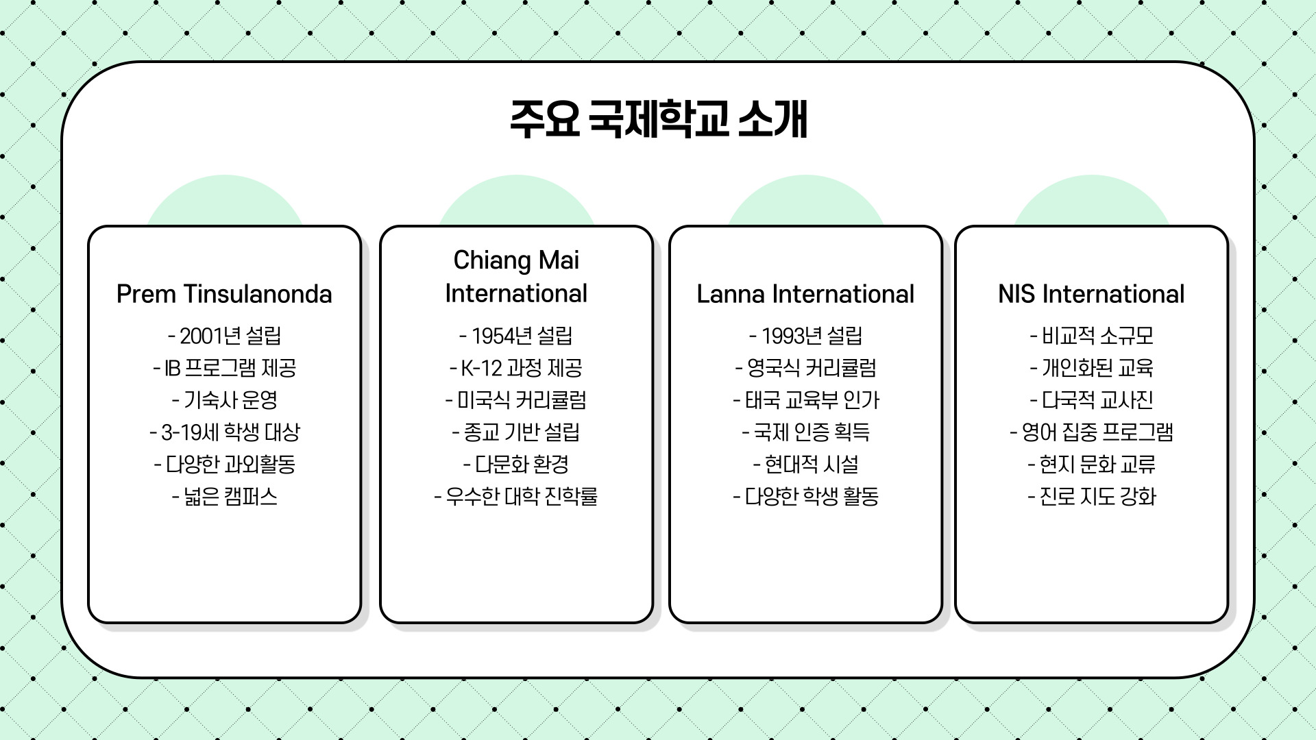 대표적인 국제학교로는 Prem Tinsulanonda International School, Chiang Mai International School(CMIS), Lanna International School, NIS International School 등이 있습니다. 이들 학교는 IB(국제 바칼로레아), 미국식, 영국식 커리큘럼 등 다양한 국제 교육 과정을 운영하고 있습니다.