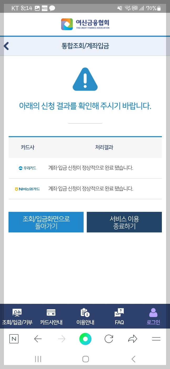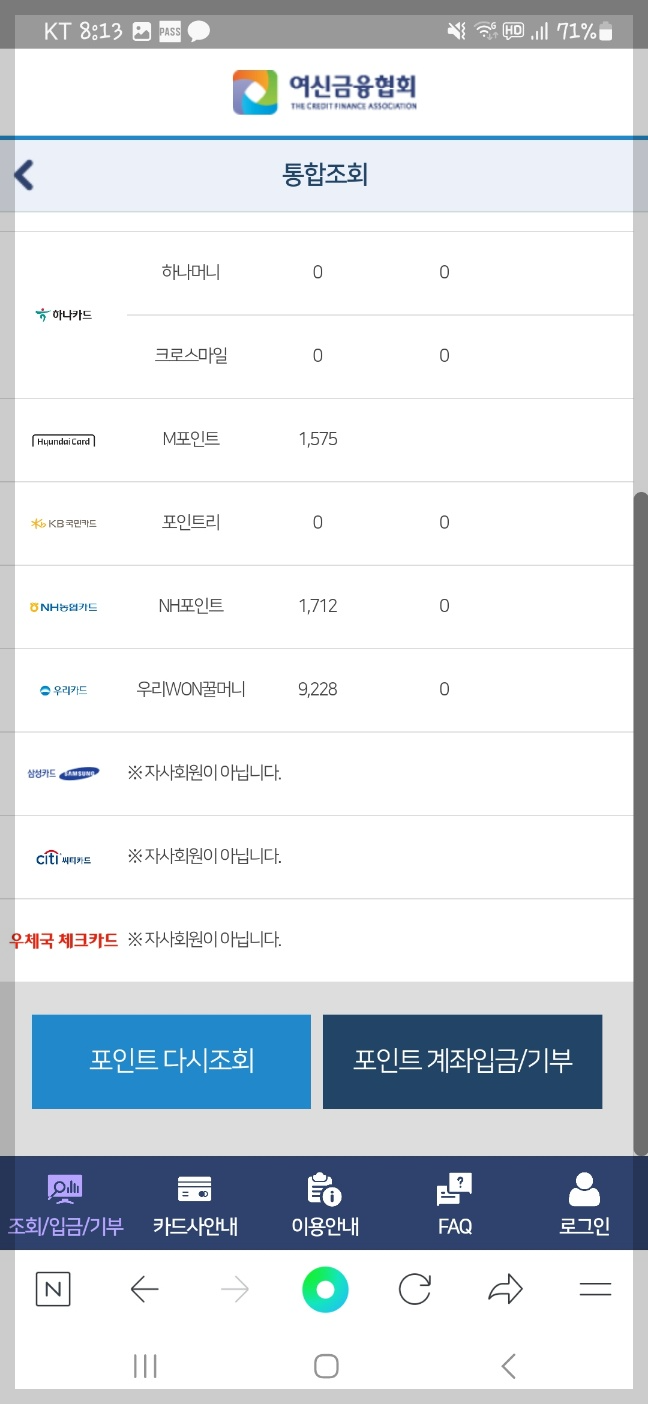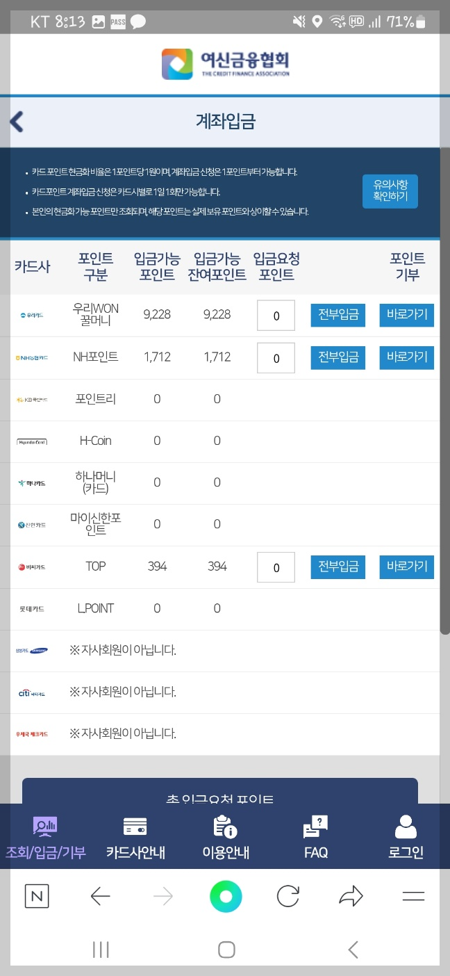 카드사별로 포인트가 조회되고 입금 받을 포인트는 "전부입금" 버튼을 눌러줍니다.