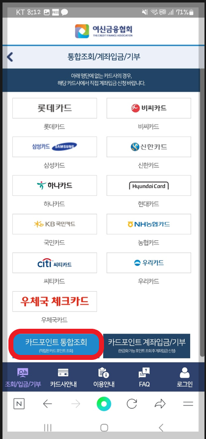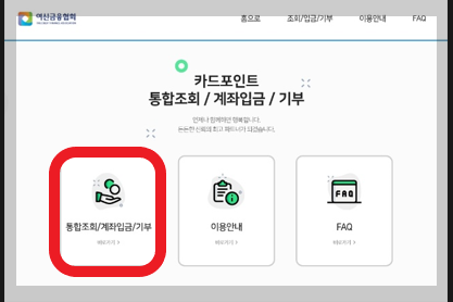 "카드포인트 통합조회시스템" 을 누르고 "통합조회/계좌입금/기부"를 눌러줍니다.