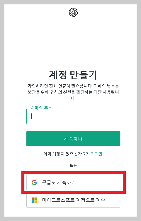 다음으로 계정을 생성합니다. 이메일 주소로 가입을 하셔도 되고 구글계정이 있다면 구글 계정으로 로그인을 하시면 됩니다. 저는 구글 계정으로 로그인 하겠습니다.