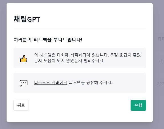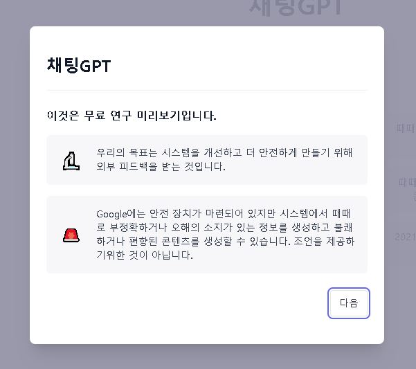 코드번호를 입력하고 나면 다음과 같은 안내문이 나오게됩니다. [다음]을 클릭하면 채팅 GPT 를 시작할 수 있습니다.